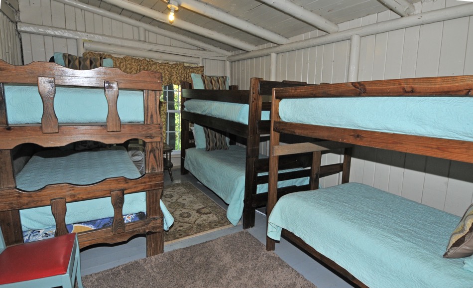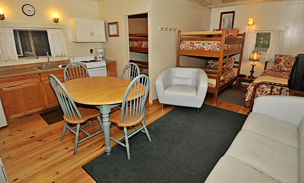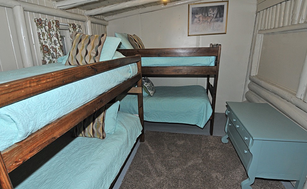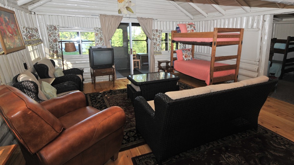 This medium-sized cabin offers three separate sleeping areas, making it a great choice for families or small groups. One bedroom includes a set of bunk beds, the kitchen/living area features another set of bunks and a twin bed, and the lakeside sunroom provides additional sleeping space with a double futon. The cabin is equipped with a heat pump for both air conditioning and heat. A private, detached bath and shower is located just 10 steps behind the cabin for your convenience.
