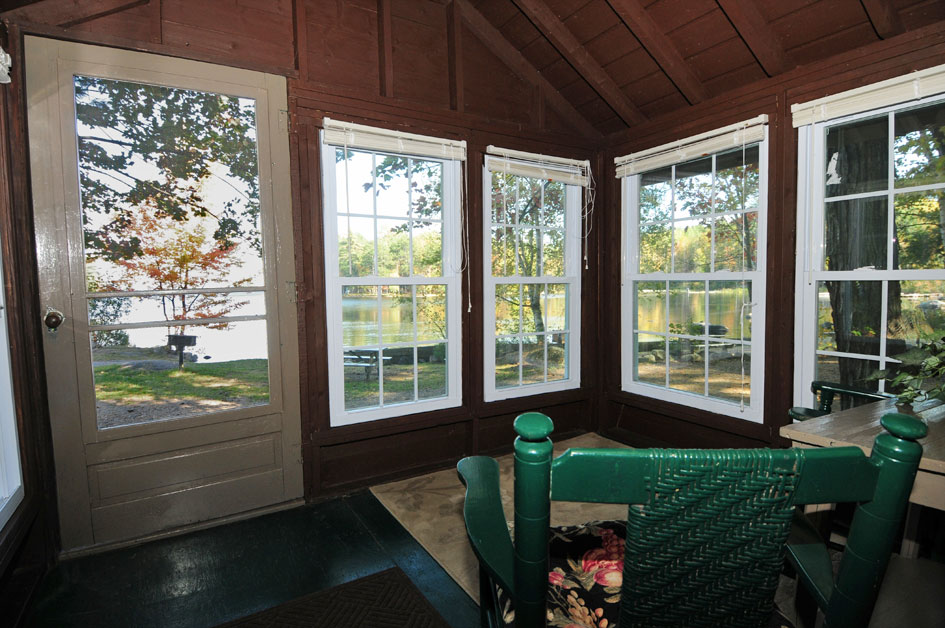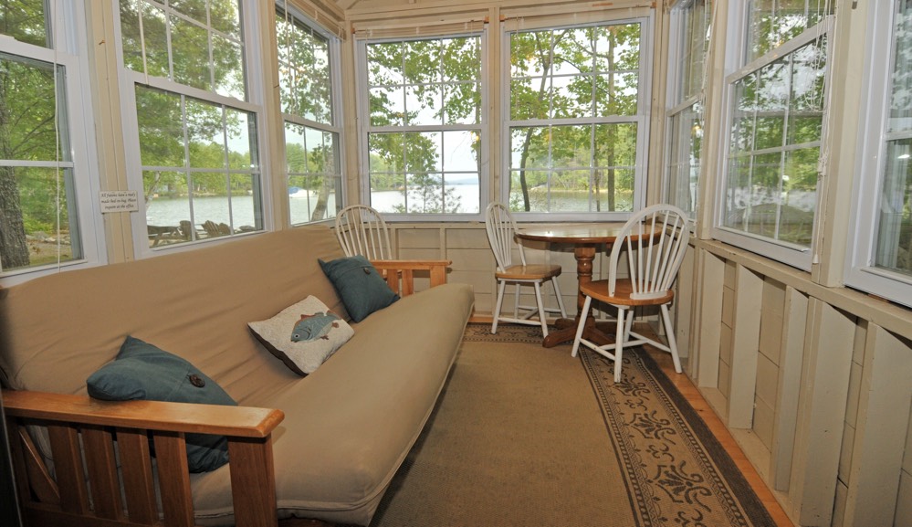 This large cabin overlooks Millinocket Lake and features a full kitchen with a stove, microwave, refrigerator, and a full bathroom. It includes three bedrooms. The first bedroom has one double bed and two single beds. The second has two single beds and two sets of bunk beds. The third includes a double bed and a bunk bed, with access to a private open-air porch with seating. Additional sleeping is available in the front room with a set of bunk beds, and the sunroom serves as an extra sleeping area with a double futon. A heat pump provides both air conditioning and heat for year-round comfort.