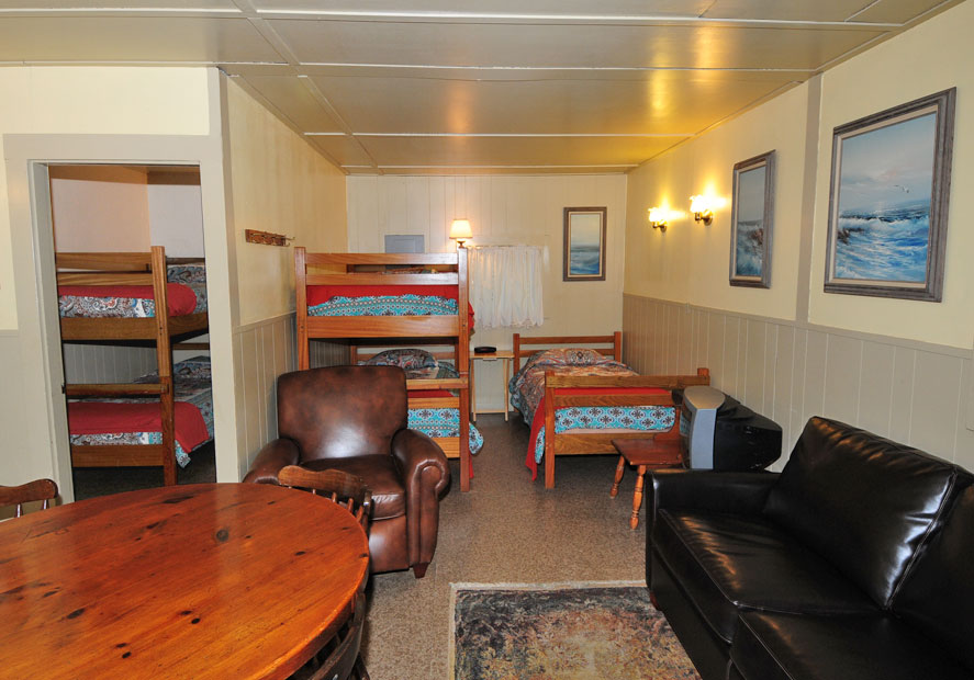 Located on the shores of Millinocket Lake, Pamola House offers spacious accommodations with a full kitchen that includes a stove, microwave, and refrigerator, along with a full bathroom. The cabin features one bedroom with four bunk beds, providing sleeping space for up to eight guests. The main room includes an additional three bunk beds. Two of these have full beds on the bottom and twin beds on top, offering room for five to seven more guests. A heat pump provides both air conditioning and heat for year-round comfort.
